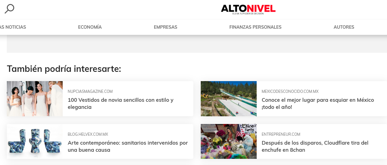 Algo que hace Alto Nivel o muchas otras paginas es hacer anuncios disimulados, las cuales al final de la pagina te hacen una serie de recomendaciones de notas que tendrían que ver con Alto Nivel, sin embargo, te llevan completamente a otra pagina externa, que son evidentemente anuncios pagados.